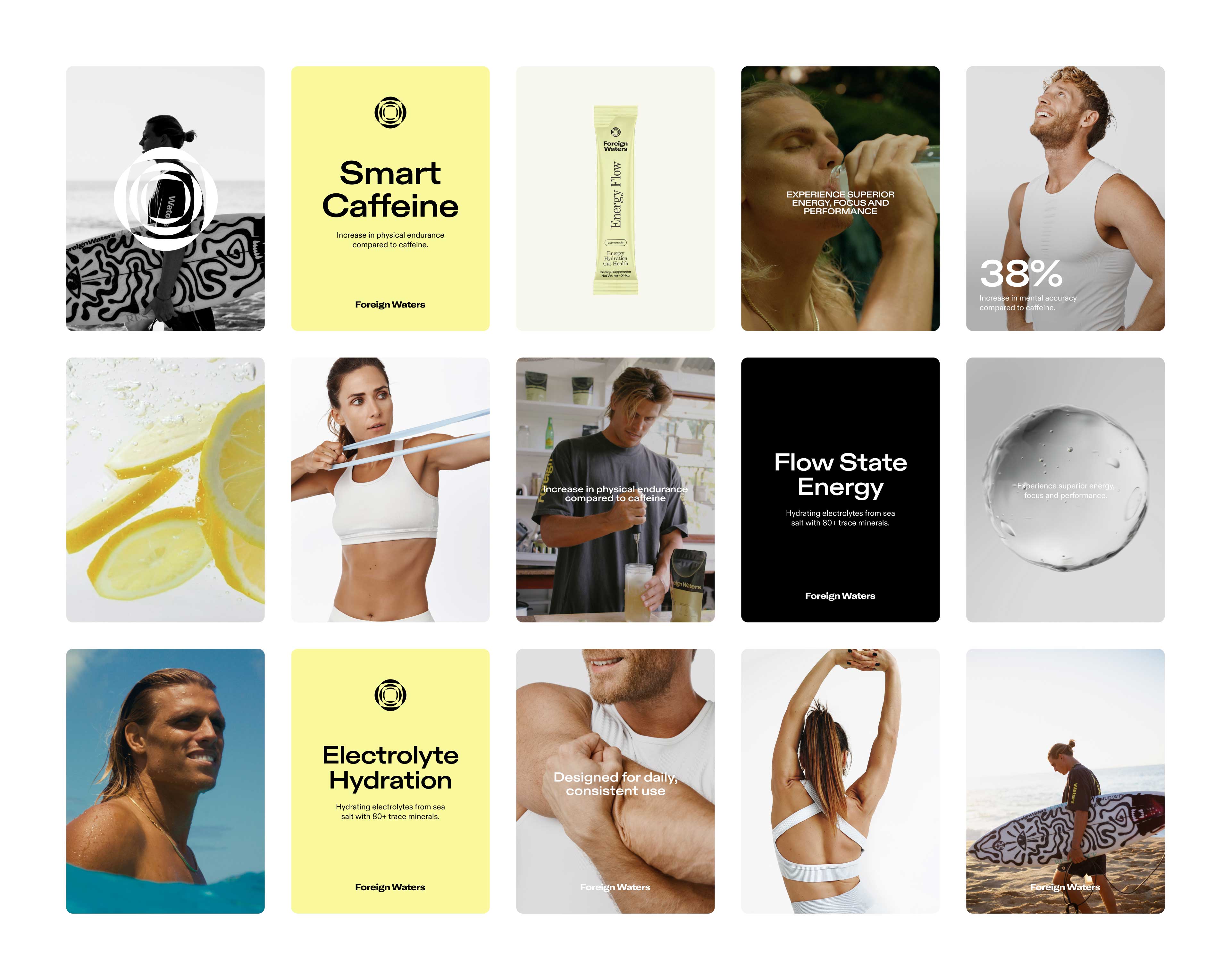 We focused on creating a clean, bold visual language that reflects energy, performance, and trust. The design combines typography, minimal layouts, and product-focused visuals to position Foreign Waters as a premium, science-backed energy drink.